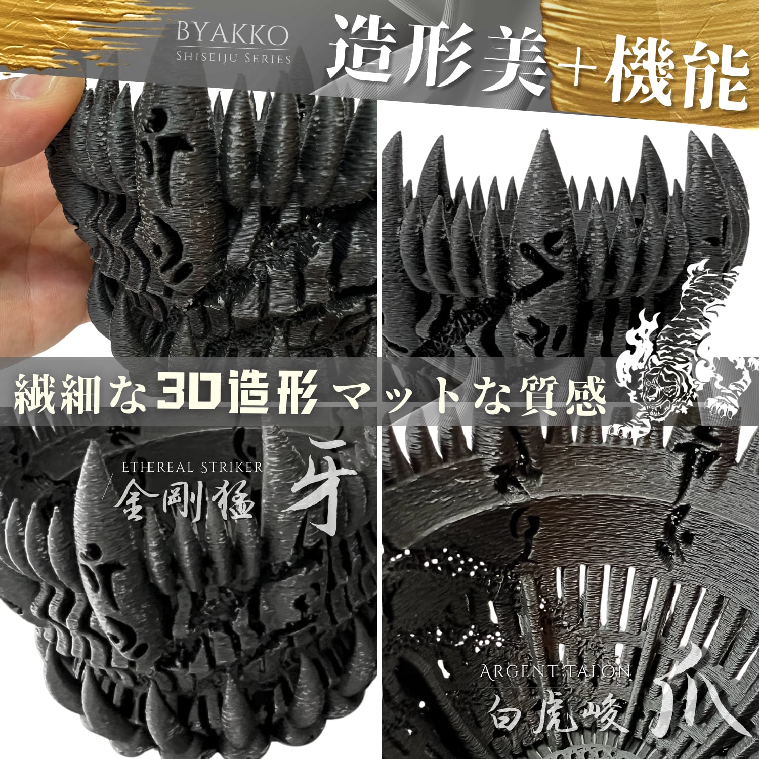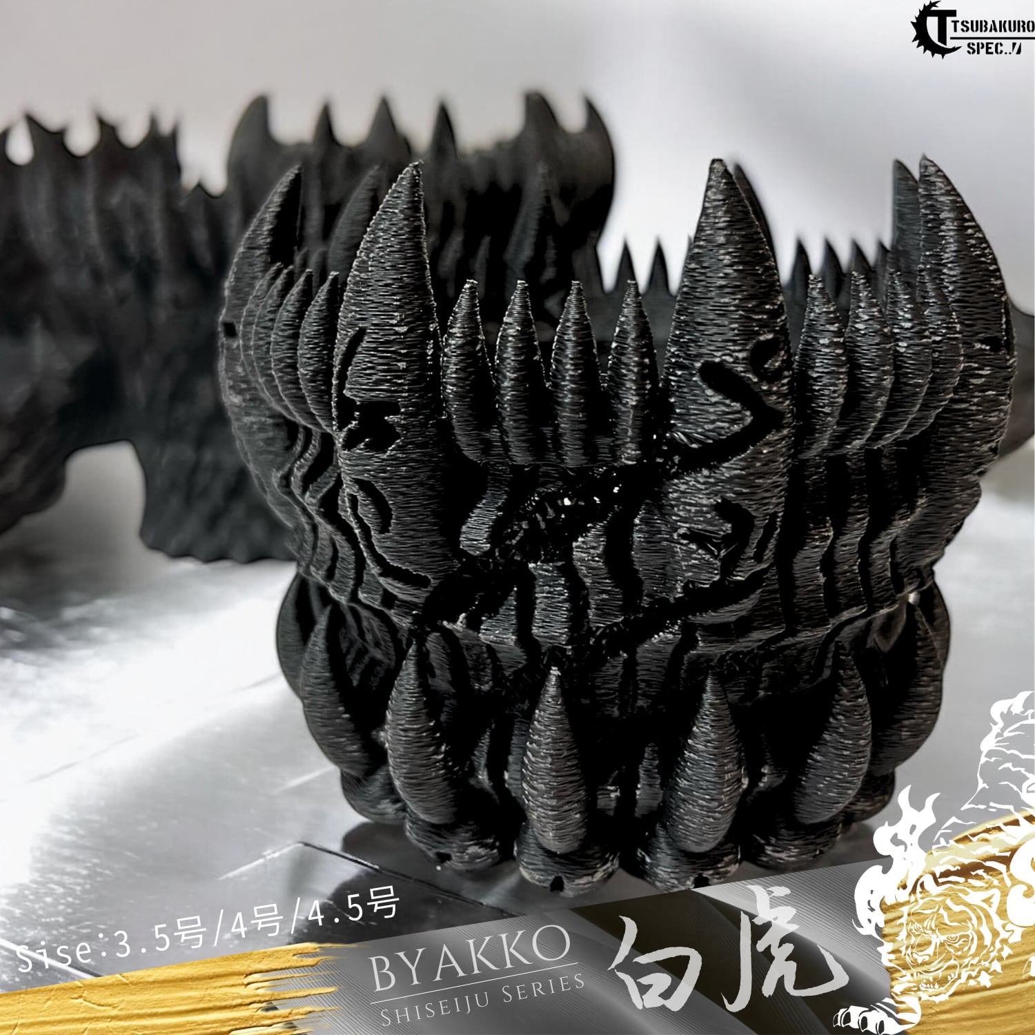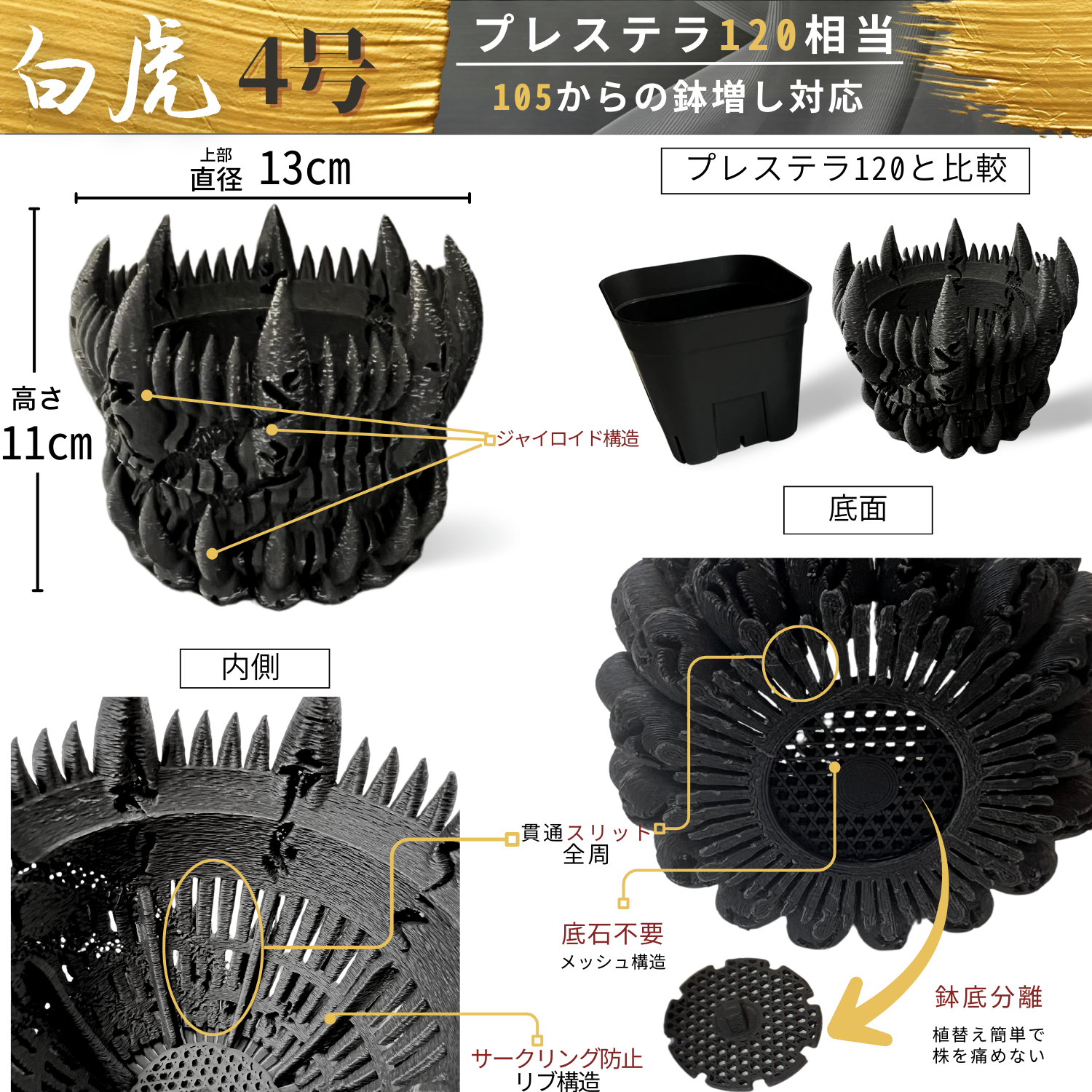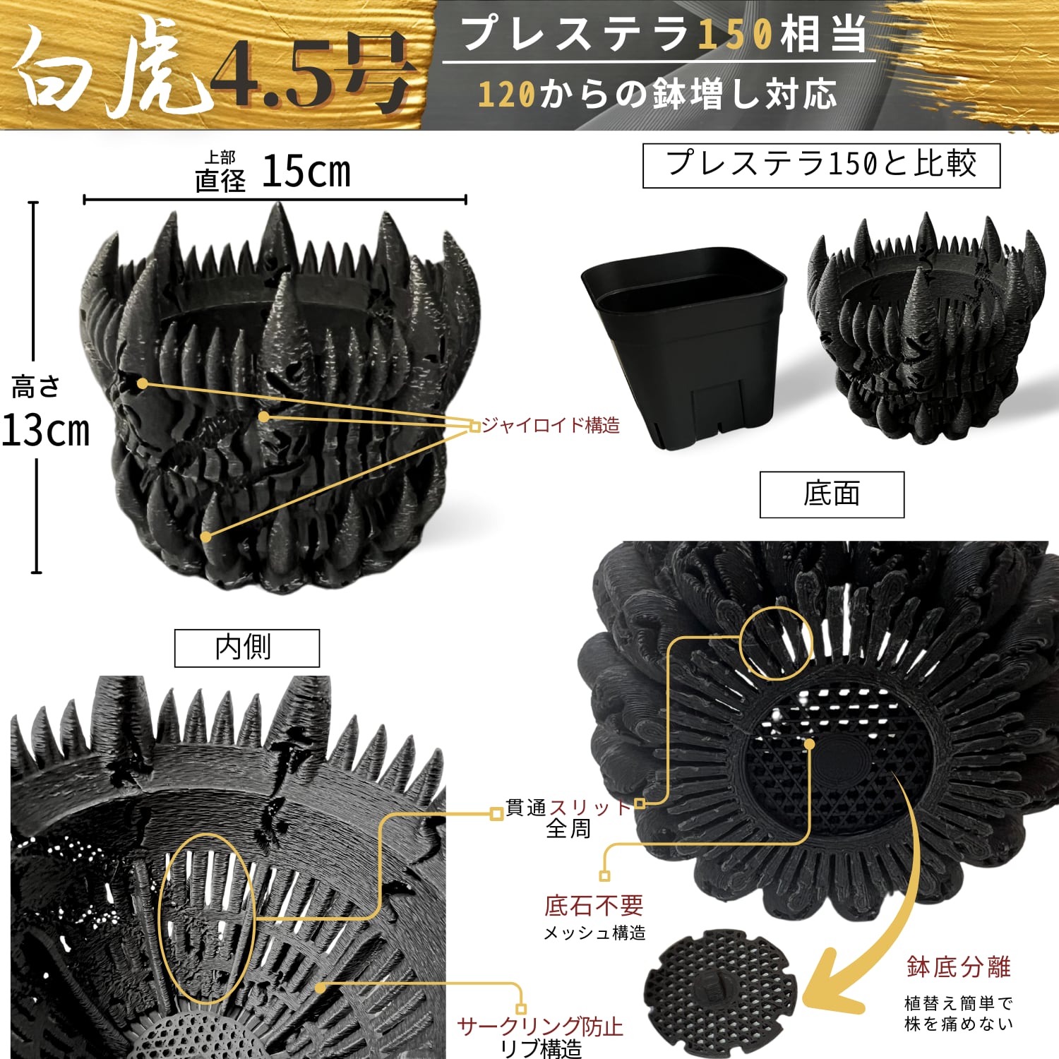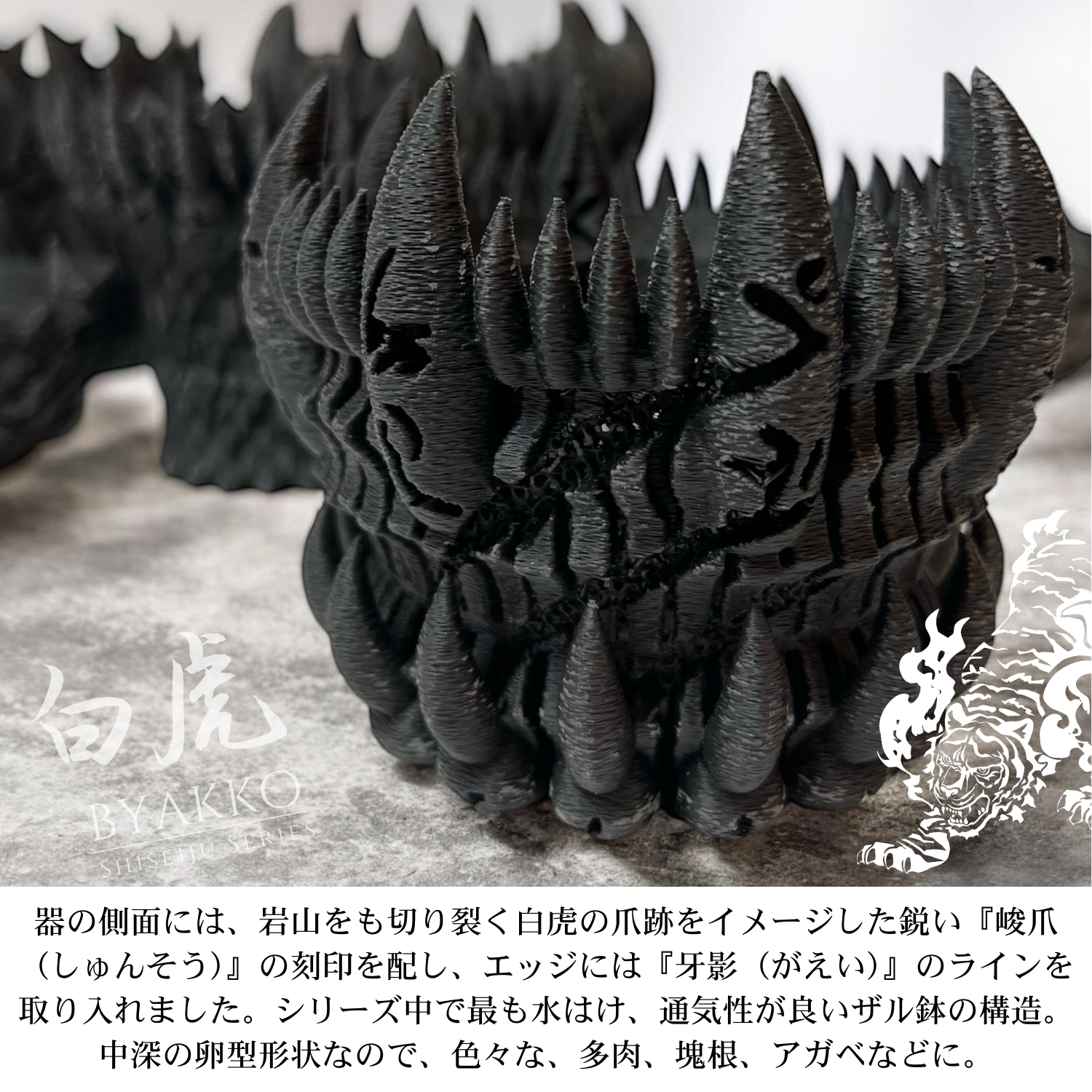 鉢の形状は、中深のテーパードで、鉢底には白虎の爪を、エッジには牙のデザインを取入れ、