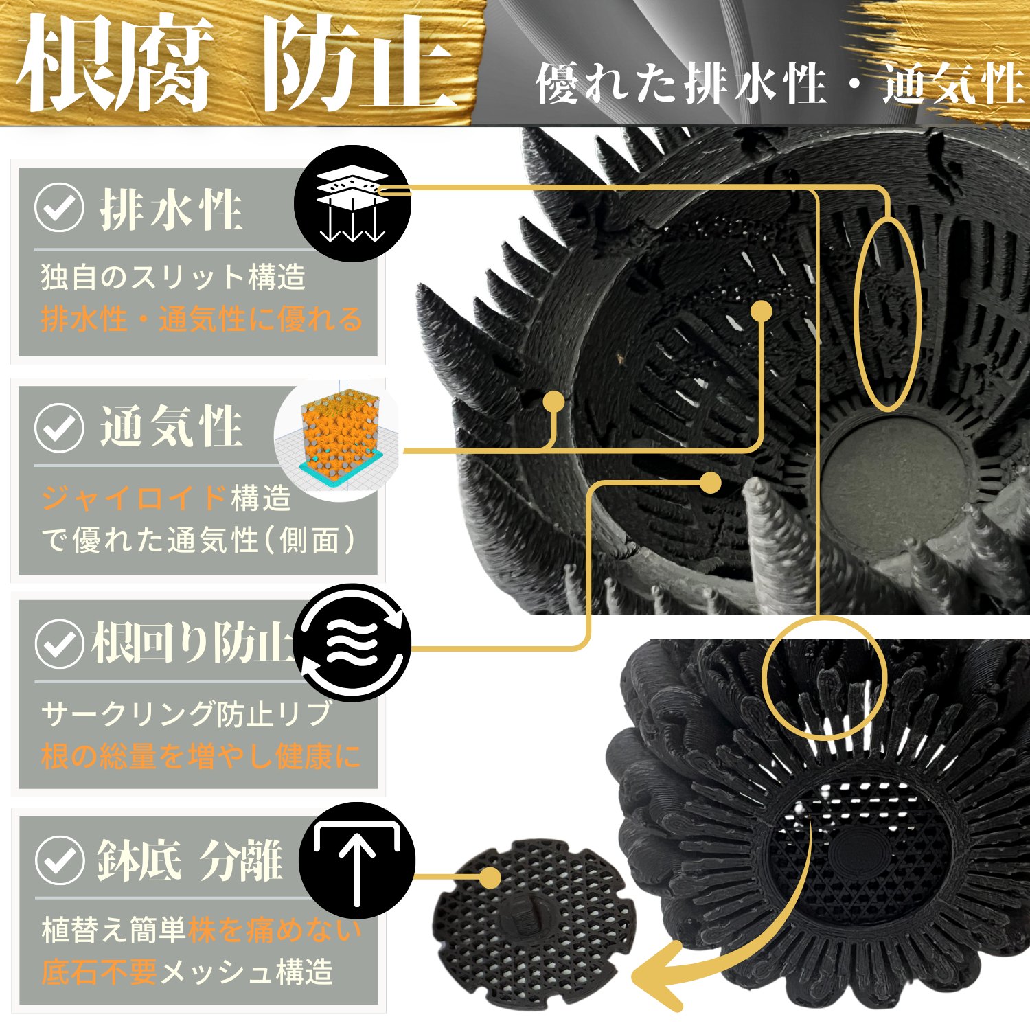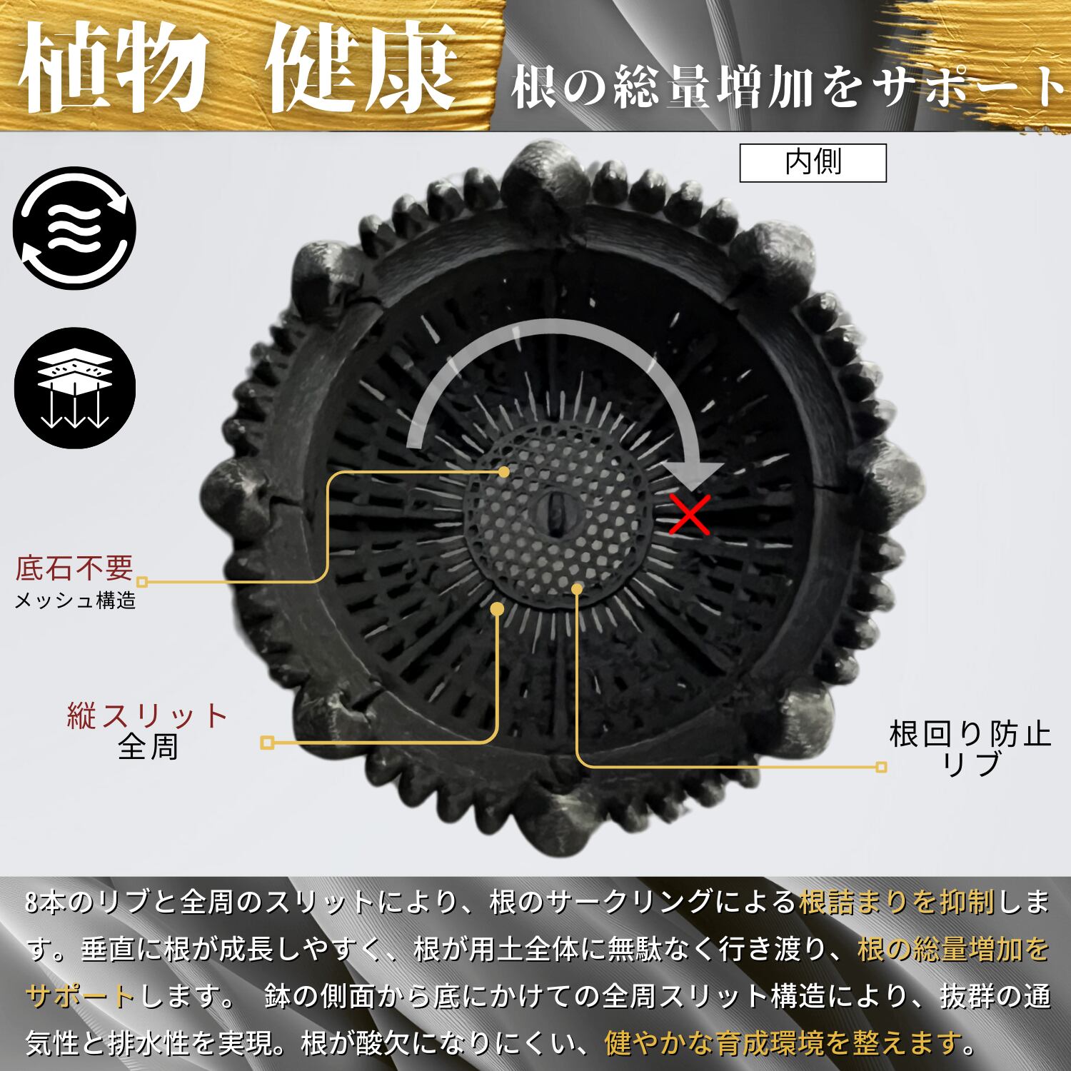 内側の8本のリブとスリットにより、根のサークリング現象・根詰まりを防止します。
