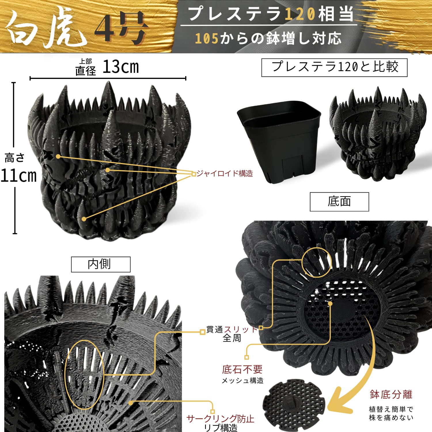 【作家鉢】白虎 / 3Dプリント鉢 アガベ 塊根植物専用 [3.5-4.5号] Tsubakuro SPEC | 3Dプリンター鉢/植木鉢・3Dプリントグッズ TsubakuroSpec(ツバクロスペック)