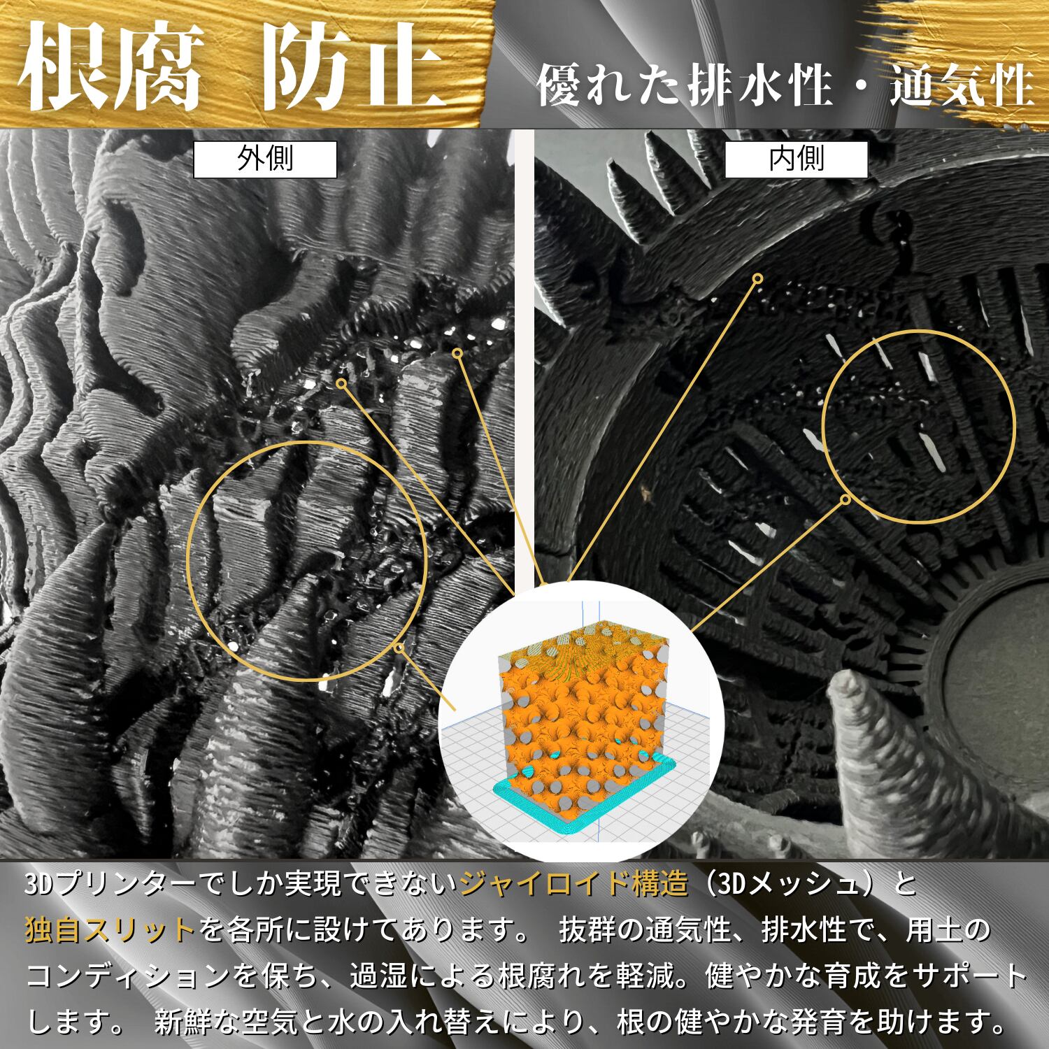 ジャイロイド構造のメッシュを各所に採用した通気性抜群の3Dプリント鉢です。