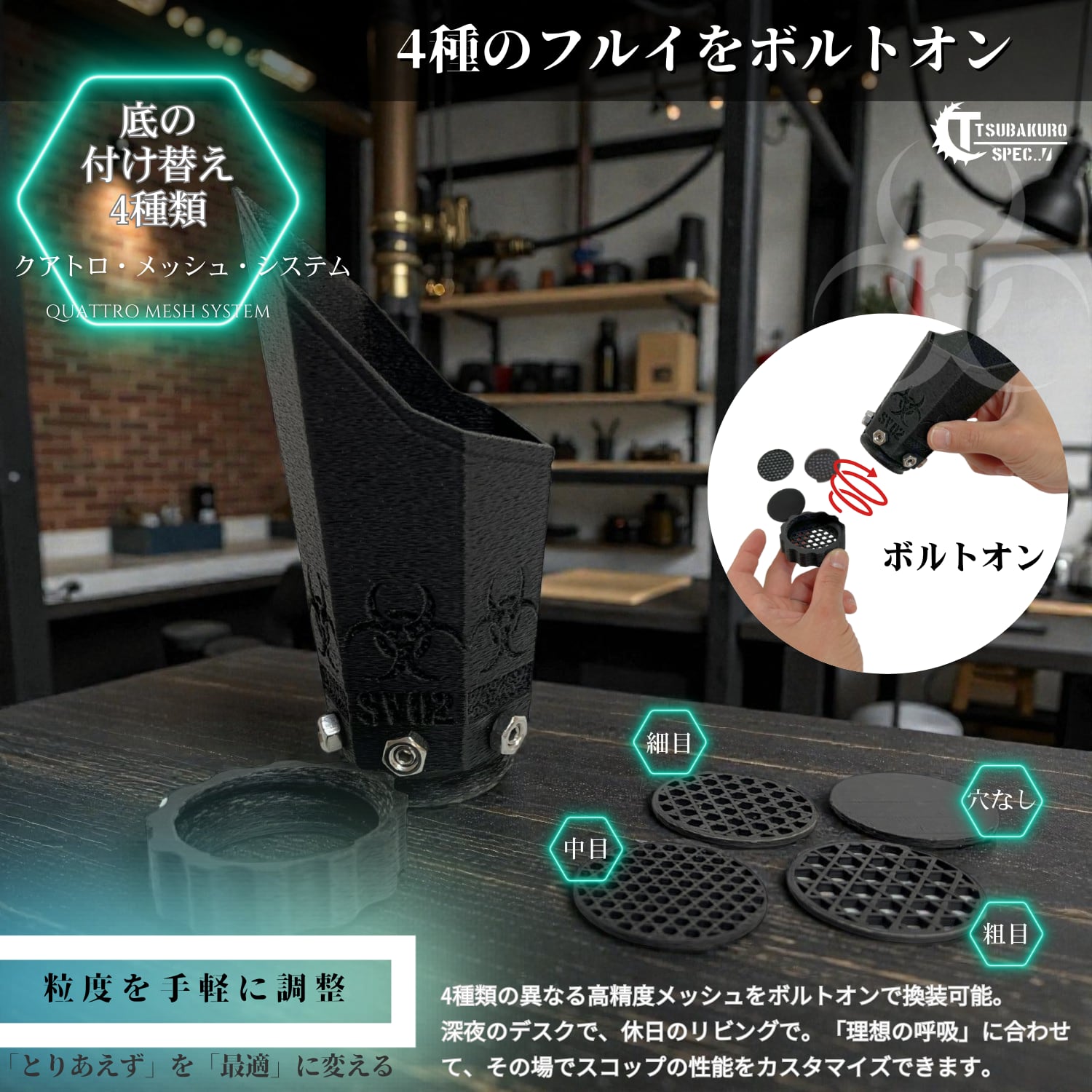 4種類の付け替えチップ付属 「穴なし・細目・中目・粗目」の4つの底パーツが付属。ソイルの粒サイズや、化粧砂(富士砂、ひゅうが土など)の種類に合わせて、最適なふるい加減に調整可能です。
