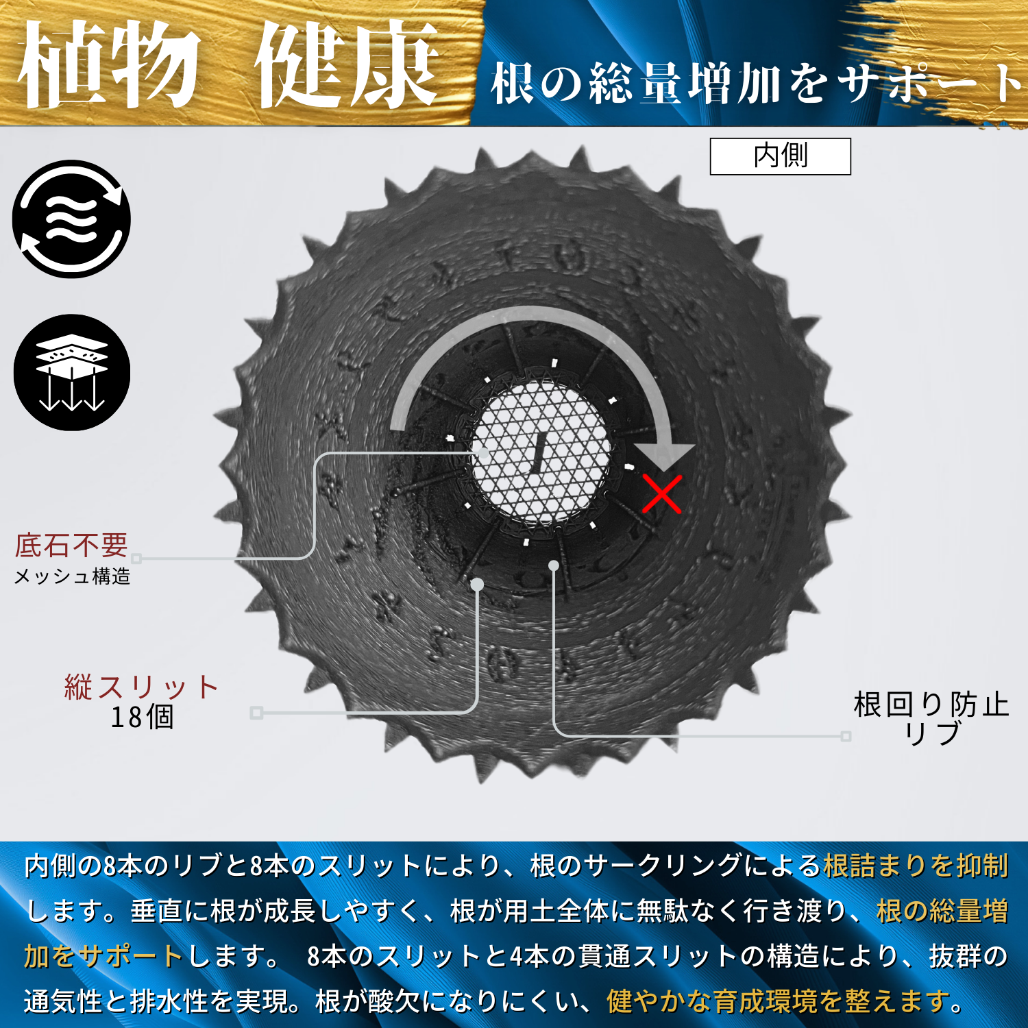 内側の8本のリブとスリットにより、根のサークリング現象・根詰まりを防止します。