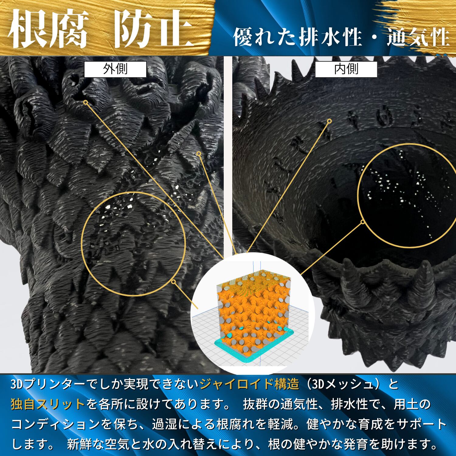 ジャイロイド構造のメッシュを各所に採用した通気性抜群の3Dプリント鉢です。