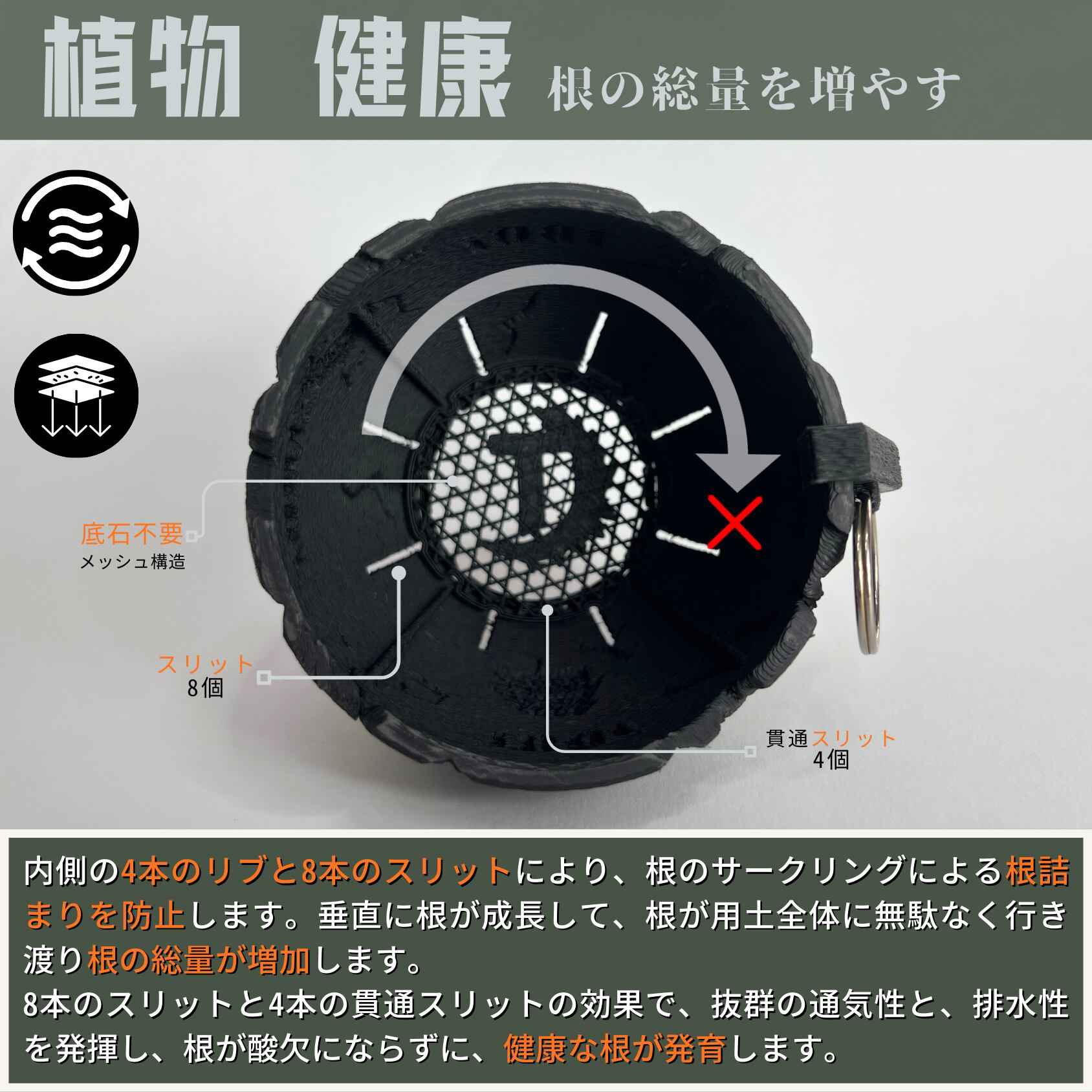 【根回り防止効果】鉢内側の4本のリブにより、根のサークリング(根回り)を防止して、根の発育を向上せ、植物の育成を促進します。