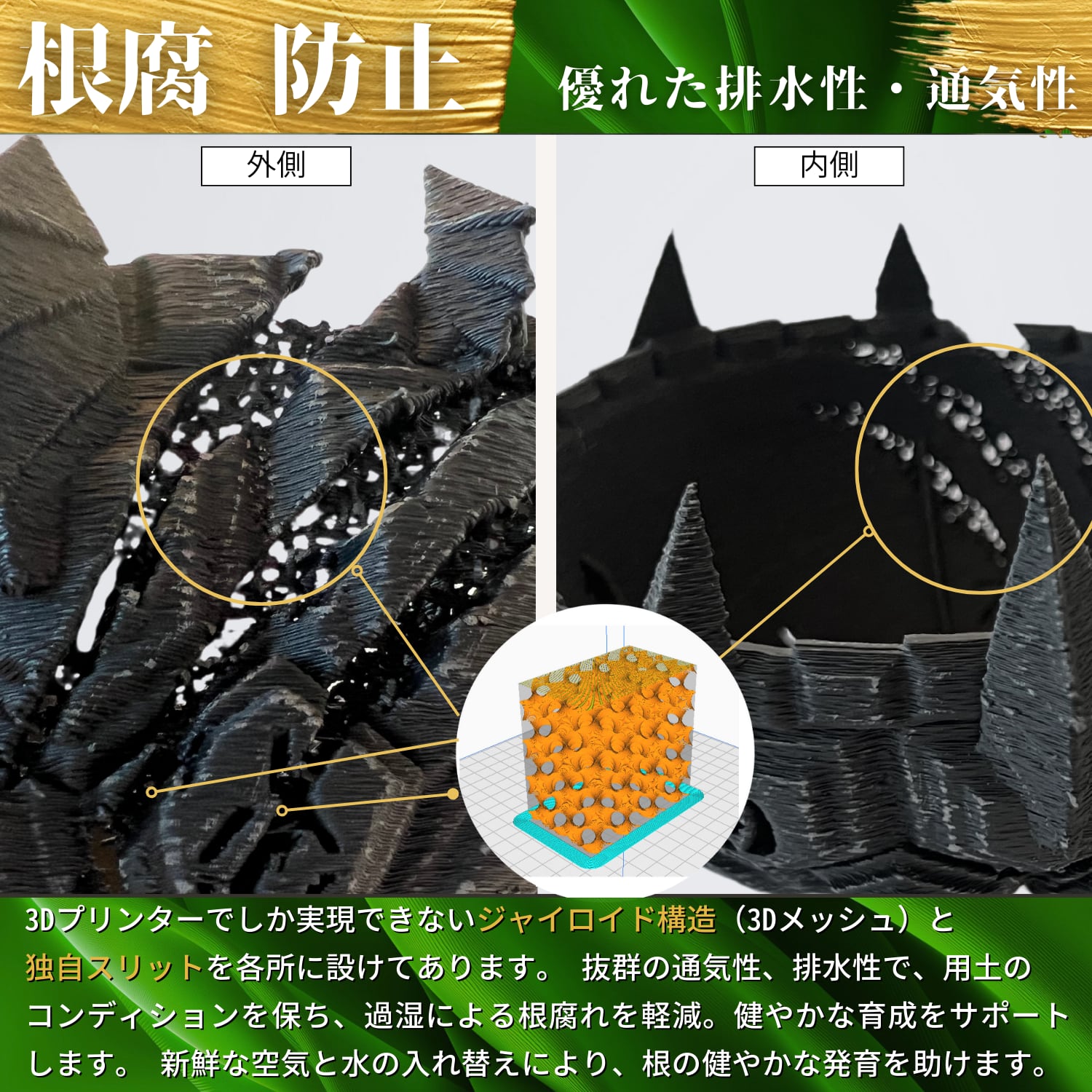 ジャイロイド構造のメッシュを各所に採用した通気性抜群の3Dプリント鉢です。